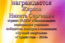 Студент 242гр. Жирнов Никита стал победителем в номинации «Спортсмен года». Студентка 141 гр., Сергеева Ольга победила в номинации «Творческая личность года». Также мы стали победителями в номинации «Лучший волонтерский отряд». Студентки 141гр – Долотова Е, Макорова В., Чумакова Т. Стали обладателями стипендии Главы Чистопольского муниципального района. Студентка 241 гр. Гарева Алена получила Благодарность Главы Чистопольского муниципального района.