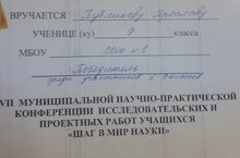 XVII муниципальной научно-практической конференции исследовательских и проектных работ учащихся "Шаг в мир науки".Публиков Ярослав - победитель