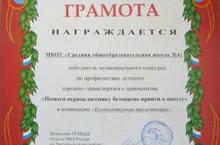 В рамках реализации мероприятий федеральной целевой программы «Повышение безопасности дорожного движения в 2006-20012 годах», с целью сокращения дорожно-транспортных происшествий с участием детей, были подведены итоги конкурса «За безопасность всей семьей». В конкурсе приняли участие следующие семьи: семья Яншиных 1в, семья Щегловых 4а, семья Паньковых 4в, семья Толстопятовых 1г, семья Сиротиных 1б, семья Вахламовых 6а.