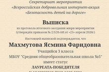 С 11 ноября 2019 г по 30 марта 2020 г. отряд ЮИД принимали участие во Всероссийской добровольной интернет-акции "Безопасность детей на дороге". Рассадин Дмитрий, Махмутова Ясмина, Кононов Даниил получили статус Лауреата-Победителя, восемь учащихся получили статус Лауреата, руководитель отряда Дмитриева А.А.получила статус Лауреата. Поздравим наших юных инспекторов дорожного движения.