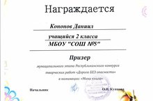 Сегодня Кононову Даниилу, учащемуся 2 Г класса была вручена грамота за участие в муниципальном этапе республиканского конкурса "Дорога безопасности", где он стал призером в номинации мини - книга "Светофор."