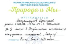 Поздравляем лауреата Республиканского экологического фестиваля школьников "Природа и мы", учащегося 2 Д класса , Пищальникова Дмитрия.