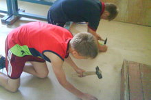 У воспитанников трудового лагеря, ведь до начала учебного года нужно успеть многое подготовить: помочь в уборке помещений, убрать школьную территорию, полить цветы. Сегодня они помогали устилать черновой пол.