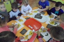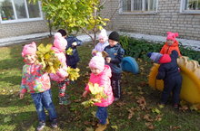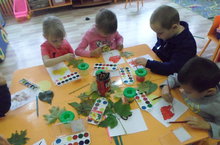 Балаларныӊ көзнеӊ характерын билгеләре белән таныштылар, дәвам итеп көзге яфраклар турында белемнәрен артырдылар. Яфраклар белән уеннар уйналды, яфракныӊ кайсы агачка туры килгәнен аердылар. Балалар яфракларны кәгазъгә төшереп төсле буяулар белән буядылар.