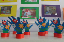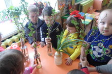 Әниләргә бәйрәм бүләге итеп балалар кәгазьгә үзләренеӊ кулларын төшерделәр, чәчәкләр белән бизәп бүләк ясадылар. Бәйрәмгэ 8 Март хатын кызлар көне белән котлау сүзләре өйрәнделәр.