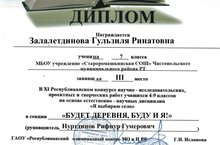 Ученица 7 класса Залалетдинова Г. участвовала и заняла III место в XI Республиканском (заочно) конкурсе научно-исследовательских, проектных и творческих работ "Я выбираю село" в номинации "Будет дереня, буду и я! ". Руководитель: Нуртдинов Р.Г.