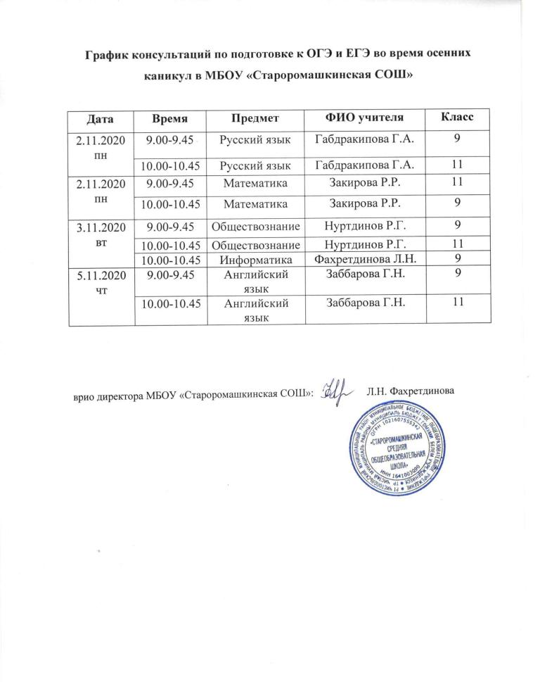 График консультаций на осенних каникулах/Көзге каникулларда ОГЭ, ОГЭ га әзерлек буенча консультацияләр графигы