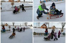 Дружно сев верхом на санки.Дети во время дневной прогулки катают друг друга на санках.