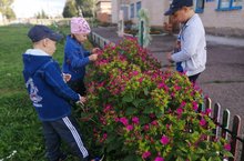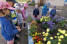 Дети разновозрастной группы во время дневной прогулки наблюдали за бархатцами на клумбе, закрепили их названия.