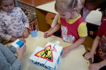 В рамках акции по ПДД "Безопасная дорога детям" со старшими дошкольниками повторили ранее изученные правила, отгадывали загадки, слушали стихи и рассказы, играли в дидактические и подвижные игры, во время прогулки отрабатывали дорожные ситуации, проговаривали правила поведения около дороги, название и значение дорожных знаков. С младшей подгруппой детей начали осваивать элементарные правила безопасного поведения около дороги, рассматривали картинки, игрушки-транспорт, играли в подвижные игры "Воробышки иавтомобиль", "Найди свой гараж", "Лошадки". На занятии в специально оборудованном классе по ПДД помогали "новенькой машинке" доехать от дома до магазина и обратно; лепили из пластилина светофор для гномиков, работали с раскрасками. Родителям были вручены памятки о мерах по профилактике безопасного поведения на дорогах и улицах, на консультации воспитатель разъяснила родителям, что собственный пример поведения является основой для правильного формирования представлений о безопасности на дорогах.