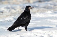 Грач является родственником вороны, его легко отличить по черной окраске и крепкому клюву с белым основанием.