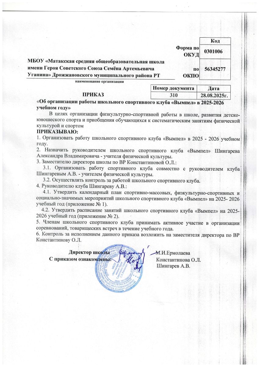 Приказ об организации ШСК "Вымпел" на 2025-2026 учебный год