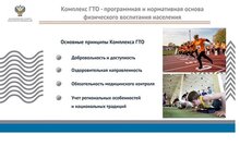 Зачем нужен комплекс ГТО? Целями ВФСК ГТО являются укрепление здоровья, гармоничное и всестороннее развитие личности, воспитание патриотизма. Задачами Всероссийского физкультурно-спортивного комплекса являются: а) увеличение числа граждан, систематически занимающихся физической культурой и спортом в Российской Федерации; б) повышение уровня физической подготовленности и продолжительности жизни граждан Российской Федерации; в) формирование у населения осознанных потребностей в систематических занятиях физической культурой и спортом, физическое самосовершенствование и ведение здорового образа жизни; г) повышение общего уровня знаний населения о средствах, методах и формах организации самостоятельных занятий, в том числе с использованием современных информационных технологий; д) модернизация системы физического воспитания и системы развития массового, детско-юношеского, школьного и студенческого спорта в образовательных организациях, в том числе путем увеличения количества спортивных клубов. ПРИНЦИПЫ ВНЕДРЕНИЯ ВФСК ГТО Всероссийский физкультурно-спортивный комплекс основывается на следующих принципах: а) добровольность и доступность; б) оздоровительная и личностно ориентированная направленность; в) обязательность медицинского контроля; г) учет региональных особенностей и национальных традиций.
