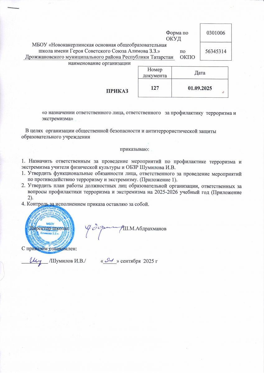 Приказ о начзначении ответственного лица, ответственного за профилактику терроризма и экстремизма