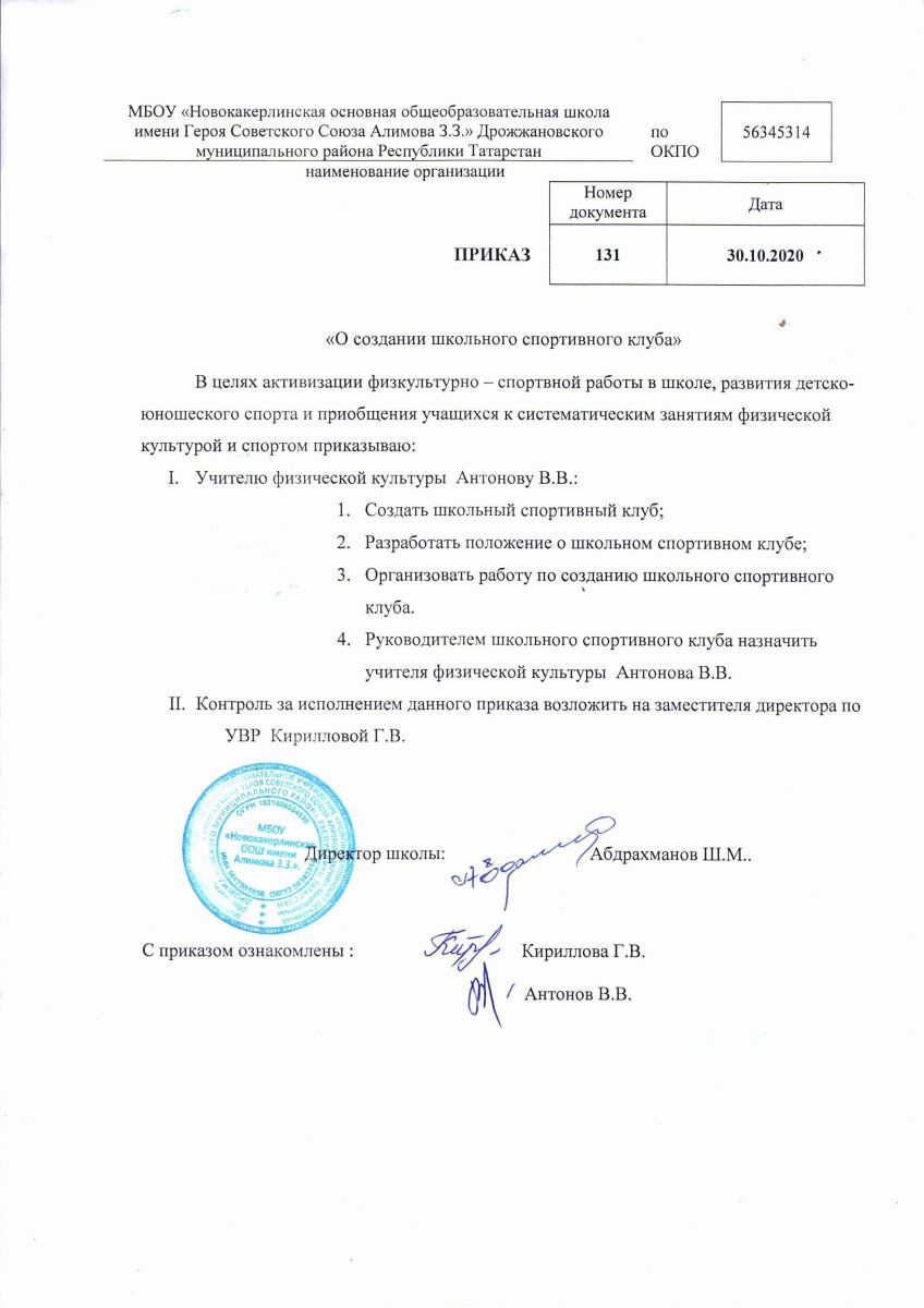 Приказ о создании школьного спортивного клуба