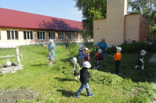 Ишек алдын яшел чирәмнән чистартабыз. Һәрвакыттагыча балалар безнең белән кайнашалар. Аларның сүзләре дә, сораулары да бик күп. Эш барышында аларга аңлатып та, җавап биреп тә торырга туры килә.