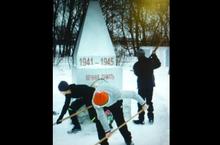 8 сыйныф укучылары Бөек Ватан сугышында катнашучылар хөрмәтенә куелган һәйкәлне карап чистартып торалар.