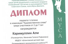 Наш воспитанник Каримуллин Али, участвовал на Республиканском патриотическом конкурсе "Красная ромашка" среди детей дошкольного возраста посвящённый 120- летию со дня рождения Героя Советского Союза, поэта Мусы Джалиля. Награжден дипломом лауреата 1 степени в номинации "Художественное слово". Поздравляем!