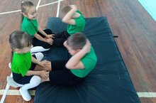 Поднимание туловища из положения лежа на спине выполняется из исходного положения: лежа на спине, на гимнастическом мате, руки за головой "в замок", лопатки касаются мата, ноги согнуты в коленях под прямым углом, ступни прижаты партнером к полу.