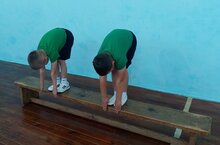 Наклон вперед из положения стоя с прямыми ногами выполняется из исходного положения: стоя на полу или гимнастической скамье, ноги выпрямлены в коленях, ступни ног расположены параллельно на ширине 10 - 15 см. При выполнении испытания на полу участник по команде выполняет два предварительных наклона. При третьем наклоне касается пола пальцами или ладонями двух рук и фиксирует результат в течение 2 секунд. При выполнении испытания на гимнастической скамье по команде участник выполняет два предварительных наклона, скользя пальцами рук по линейке измерения. При третьем наклоне участник максимально сгибается и фиксирует результат в течение 2 с. Величина гибкости измеряется в сантиметрах. Результат выше уровня гимнастической скамьи определяется знаком «-», ниже - знаком «+». Во время выполнения данного теста можно использовать игровой момент «достань игрушку».