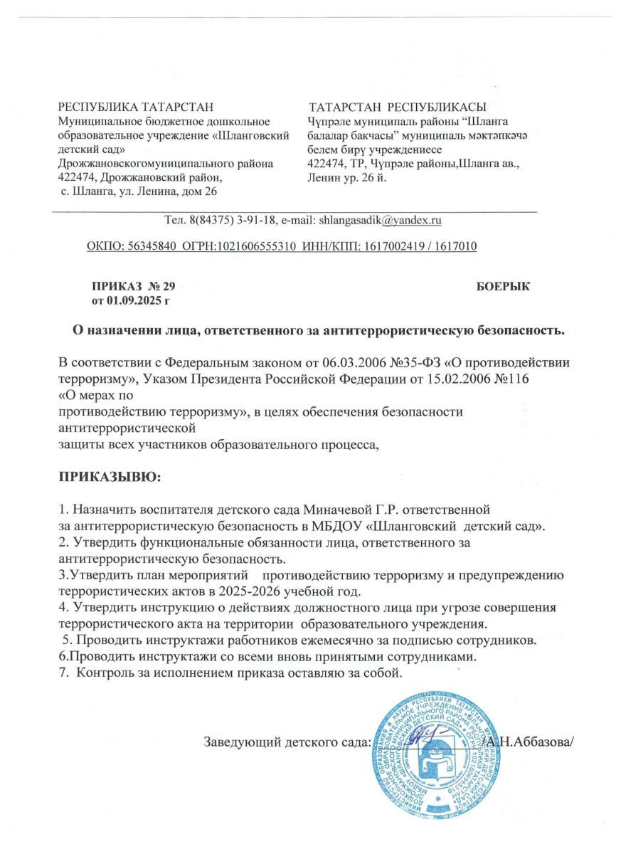 Приказ о назначении ответственного за антитеррористическую безопасность 2025 г.