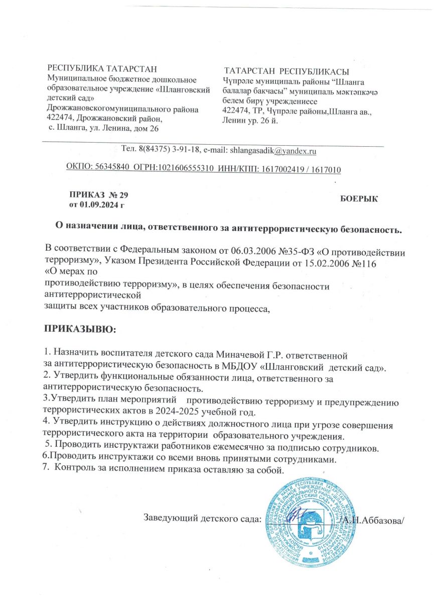 Приказ о назначении ответственного за антитеррористическую безопасность 2024 г.