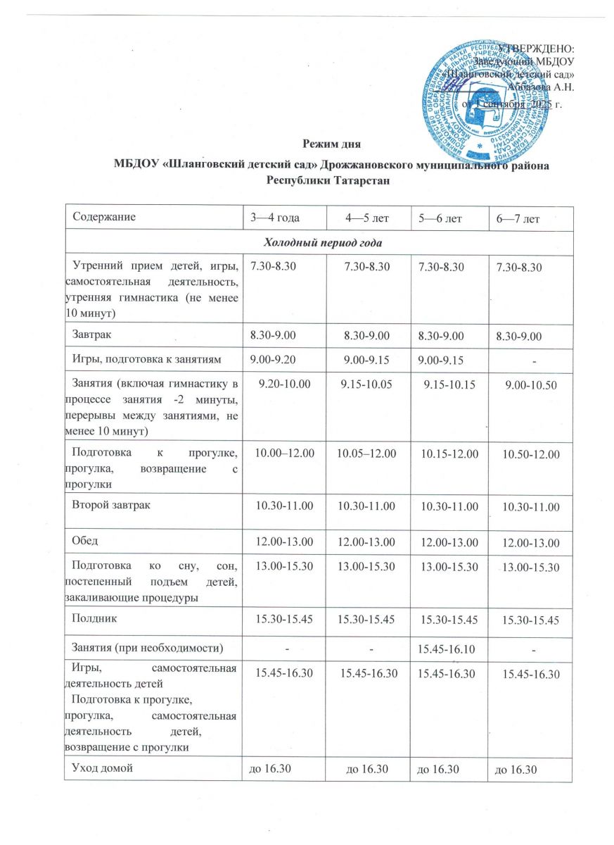 Режим дня на холодный оздоровительный период на 2025-2026 год в МБДОУ "Шланговский детский сад"