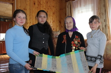 7 мая члены кружка по ткачеству и мастерской «Народное ткачество» побывали в гостях у ветерана ВОВ Калачевой Валентины Петровны. Девочки пришли не с пустыми руками: специально к 9 мая были сотканы Георгиевские ленточки, одну из них вручили ветерану, и подарили сотканную дорожку. Валентина Петровна была тронута ручными работами детей, она рассказала о тяготах военной жизни и пожелала всем живущим Мира на земле. А мы пожелали ей крепкого здоровья, радости и счастья.