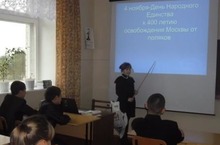 29 октября в нашей школе проводился классный час, посвященный Дню народного единства. Учащиеся 5-10 классов подготовили презентации и выступили перед своими одноклассниками. Они собрали интересный материал о тех далеких временах, о герое Иване Сусанине, о поляках, которым удалось захватить Москву.
