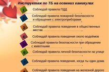 Внимание: осенние каникулы! 25.10.2024Сегодня классными руководителями были проведены классныечасы - инструктажи по технике безопасности в период осенних каникул.Учащиеся повторили общие правила поведения во время каникул, правила поведения на дорогах: находясь вблизи водоёмов, не входить в воду, не ходить по краю обрыва, быть внимательным и осторожным на проезжей части дороги, соблюдать правила дорожного движения, использовать светоотражающие элементы на одежде, быть внимательным при обращении с электронагревательными приборами, не играть со спичками, зажигалками, не заходить в заброшенные дома и здания. Старшеклассникам напомнили, что запрещается находиться на улице без сопровождения взрослых после 22.00 часов, избегать сомнительные компании. Памятки «Внимание: осенние каникулы!» с напоминанием о необходимости соблюдения безопасного поведения на улице, дома и на дороге, а также были разосланы в чаты родителей.