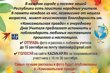 Республиканың һәр шәһәрендә һәм Бистәсендә чын-чынлап халык укытучылары бар. Безнең һәркайсыбызның хәтерендә, нинди яшьтә булуына карамастан, аларга бетмәс-төкәнмәс рәхмәт яши. » Комсомольская правда " укытучыларның чираттагы көненә узган һәм бүгенге көндәге яраткан остазларына рәхмәт әйтергә тәкъдим итә . Яраткан укытучысы турында 15 сентябрьгә кадәр почтага фото һәм хикәя җибәр nbelovakp@gmail.com Сайттагы тавыш бир KAZAN.KP.RU 15-30 сентябрь көннәрендә ошаган катнашучы өчен . Конкурста өч җиңүче билгеләнәчәк. Нәкъ менә алар конкурсның партнеры - «китап йорты " китап кибетләре челтәре исеменнән бүләкләр алачак» 1 урын-1000 сумлык сертификат; 2 урын-500 сумлык сертификат.; 3 урын-500 сумлык сертификат. Иң яхшы хикәяләр һәм фотолар «Комсомольская правда»газетасында басылып чыгачак. Чараны оештыручы, вакыты, кагыйдәләре, бүләкләре һәм аларны алу сроклары турында мәгълүматны 226-05-05 телефоны буенча һәм сайтта ачыклагыз kazan.kp.ru