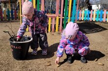 Воспитанники всех групп помогают воспитателям проводить уборку своих прогулочных участников. Так малыши группы N2 помогают собирать ветки и камни, подметают участок.