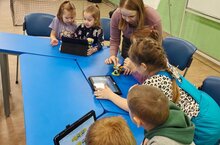 Воспитанники подготовительной группы детского сада N 12 "Солнышко" посетители занятие в Доме научной коллаборации. Тема занятия была "Робот с датчиком наклона "Сверчок".