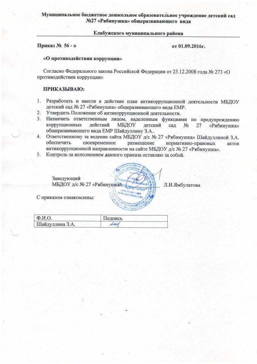 7) Приказ ДОУ от 01.09.2016 №56-о-О противодействии коррупции.