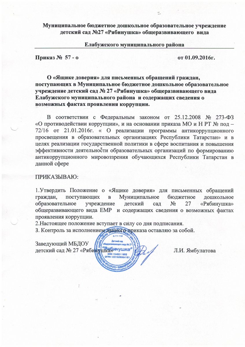 8) Приказ ДОУ от 01.09.2016 №57-о- О ящике доверия