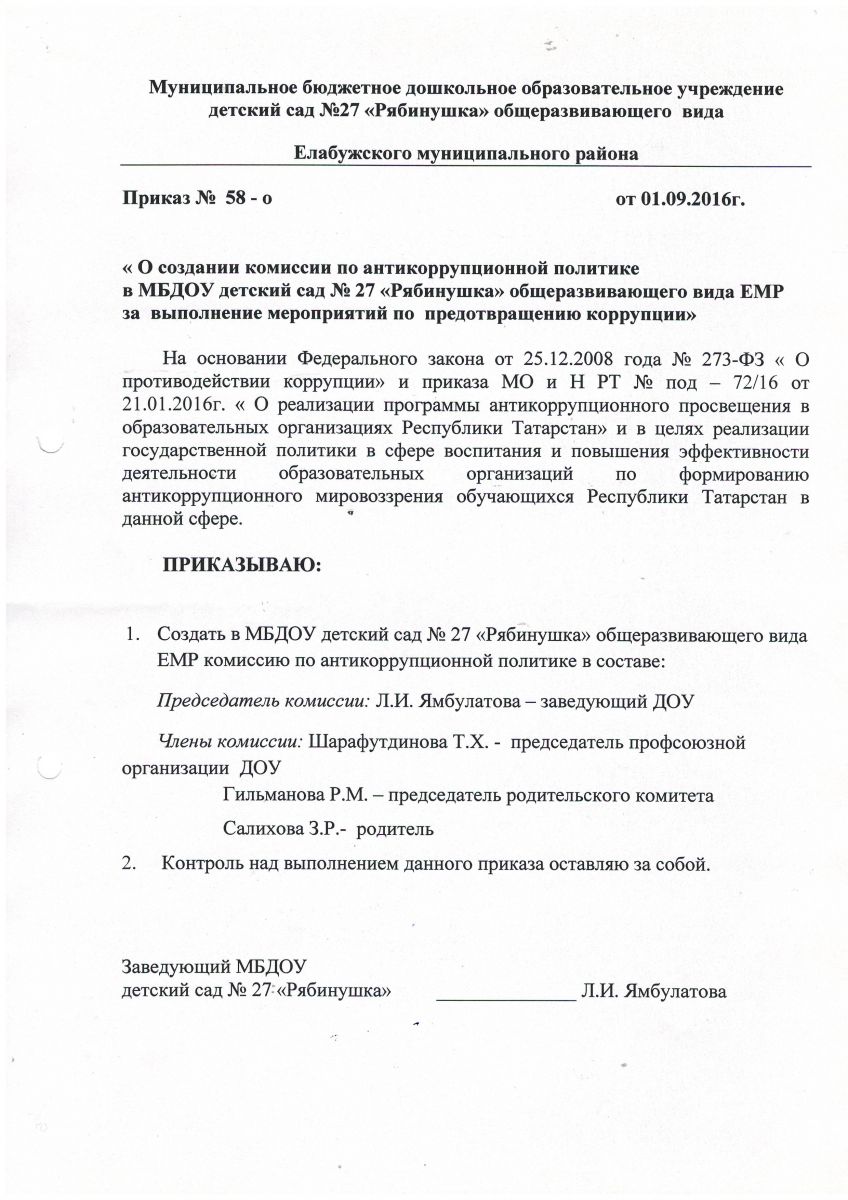 9)Приказ ДОУ от 01_09_2016 №58-О создании комиссии