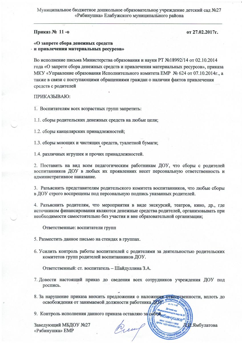 11) Приказ ДОУ от 27.02.2017 №11-о О запрете сбора средств