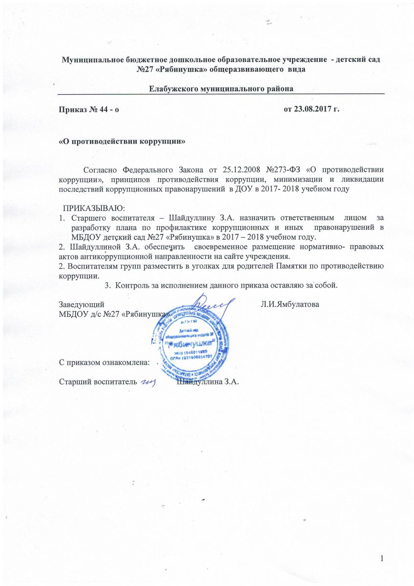 10) Приказ ДОУ от 23.08.2017 №44-о О противодействии коррупции