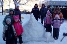 Вот и закончились зимние каникулы, ребята с огромным удовольствием и радостью спешили в детский сад. Очень уж соскучились по своим друзьям, игрушкам. И, конечно, с нетерпением ждали прогулку. Ведь наш участок за время зимних каникул очень преобразился и стал очень красивым. Пришли родители, несмотря на мороз ниже 20 градусов. Все дружно взялись за работу. Работа кипела! Папы приносили в ведрах воду, некоторые папы носили снег в вёдра. Мамочки занимались лепкой! И слепили прекрасную Курочку Рябу. Так же папы сделали горку, залили водой, чтобы дети могли с удовольствием кататься с горки. Мамы украсили веранду кружевными снежинками. Вечером, забирая детей из детского сада, не торопятся они домой. Идут на участок, играют, катаются на горке, фотографируются и бережно относятся к нашим постройкам.