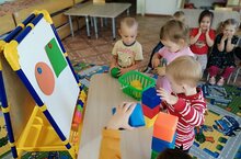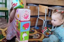 В детском саду "Теремок" продолжается набор воспитанников в ясельную группу. Дети проходят адаптационный период, попав в новую обстановку, потихоньку знакомятся с жизнью в садике. Они приглядываются к другим детям, с интересом рассматривают и изучают новые игрушки, привыкают к новому режиму дня. Сегодня ребяткам из группы дали представление о башне как высокой постройке. Объясняли детям о том, что для того, чтобы построить башню или пирамиду, нужно один предмет класть на другой. Учили различать и находить основные цвета для постройки.