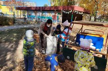 В нашем детском саду ребята любят помогать воспитателям в уборке игрового участка. Вот и сегодня они вместе с воспитателями убирали опавшие листья. Безнең балалар бакчасында балалар тәрбиячеләргә уен участогын җыештыруда ярдәм итәргә яраталар. Менә бүген дә алар тәрбиячеләр белән бергә коелган яфракларны җыештырдылар.