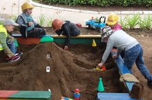 Ребята решили сегодня примерить на себя роль строителей: используя атрибуты профессии, распределили роли, придумали интересный сюжет игры, построили городок из песка. Балалар бүген төзүчеләрнең ролен сынап карарга булдылар: һөнәр атрибутларын кулланып, рольләрне бүлештеләр, уенның кызыклы сюжетын уйлап таптылар, комдан шәһәрчек төзеделәр.