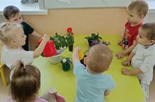 В группе раннего возраста, дети в уголке природы наблюдают за комнатными растениями, и ухаживают за цветами в группе, рассматривают , как пахнут, какого цвета, большие и маленькие.