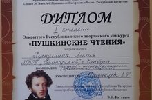 Сегодня в МАОУ "Лицей №78 им. А.С. Пушкина" г. Набережные Челны РТ состоялся Открытый Республиканский творческий конкурс "Пушкинские чтения", в котором приняли участие окола 800 учащихся со всех городов России. Ученица 10 класса МБОУ "Гимназия №2" ЕМР РТ Хуснуллина Лилия заняла I место в номинации "Научно-исследовательские (проектные) работы" творческого конкурса, за что награждена дипломом I степени (руководитель Л.Р. Матанцева). Молодец!