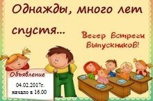 04 февраля 2017 года с 16.00 до 18.00 ч. в МБОУ «Гимназия №2» ЕМР РТ по ул.Тугарова, д.6 состоится торжественное мероприятие, посвященное вечеру встреч выпускников. -