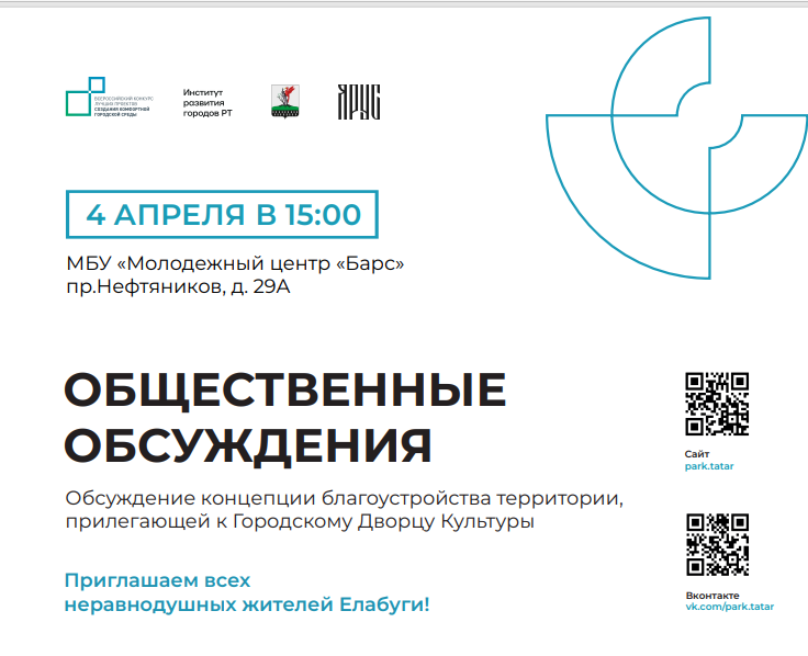 4 апреля в 15 часов МБУ «Молодежный центр «Барс» (пр.Нефтяников, д. 29А) проводит обсуждение концепции благоустройства территории, прилегающей к Городскому Дворцу Культуры. Приглашаются все неравнодушные жители Елабуги!
