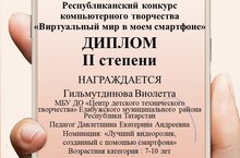14.12. 2021г. под руководством педагога ДО объединения "Азбука пешехода" Давлетшиной Е.А. обучающаяся Гильмутдинова Виолетта получила диплом II степени в Республиканском конкурсе компьютерного творчества «Виртуальный мир в моём смартфоне» в номинации "Лучший видеоролик, созданный с помощью смартфона".