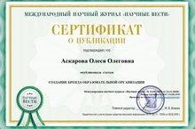 17 ноября 2020 года педагог ДО Аскарова О.О. опубликовала статью в международном научном журнале «Научные вести» на тему «Создание бренда образовательной организации»