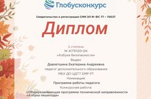 13 ноября 2020 года педагог ДО Давлетшина Е.А. опубликовала программу работы педагога «Общеразвивающая программа технической направленности «Азбука пешехода» и получила свидетельство о публикации методического материала педагога редакции Глобоконкурс, и получила диплом 2 степени.