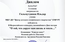 19 ноября 2020 года под руководством педагога ДО объединения НТМ Арслановой Разалии Раисовны, ученик Гильмутдинов Ильдар получил диплом I степени во II Всероссийском конкурсе, посвященном Дню матери «О той, что дарует нам жизнь и тепло…» в номинации «Я рисую маму!», педагог получила благодарственное письмо. Поздравляем!
